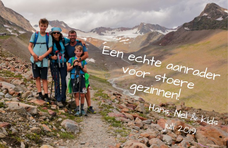 'Wij hebben eind juli-begin augustus de tocht in het Ötztal gelopen met onze twee kinderen van 15 en 12 jaar oud. Ik vond de lengte van vier dagen heel prettig en de dagen (qua wandelen en qua uitzichten/landschap) waren heel gevarieerd. We hebben alle weersomstandigheden meegemaakt.